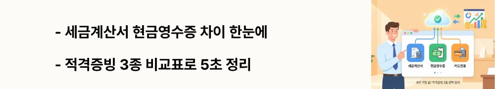 적격증빙은 크게 세 가지로 나뉩니다. 세금계산서 현금영수증 차이와 현금영수증 카드영수증 차이를 명확히 이해하면 증빙서류 보관방법도 훨씬 쉬워집니다.