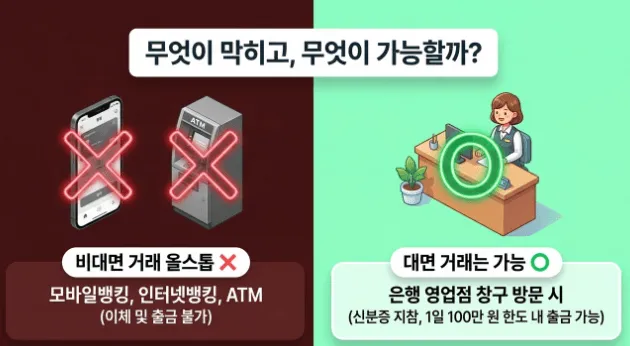 사기이용계좌로 지정되면 ATM·인터넷뱅킹·모바일뱅킹 등 비대면 거래가 모두 차단됩니다. 하지만 헌법재판소가 확인한 바와 같이 영업점 창구에서 신분증을 지참하고 직접 거래하는 것은 제한 범위에 포함되지 않습니다. 전자금융거래 제한은 전자금융거래법상의 '전자금융거래'에만 적용되기 때문이에요.